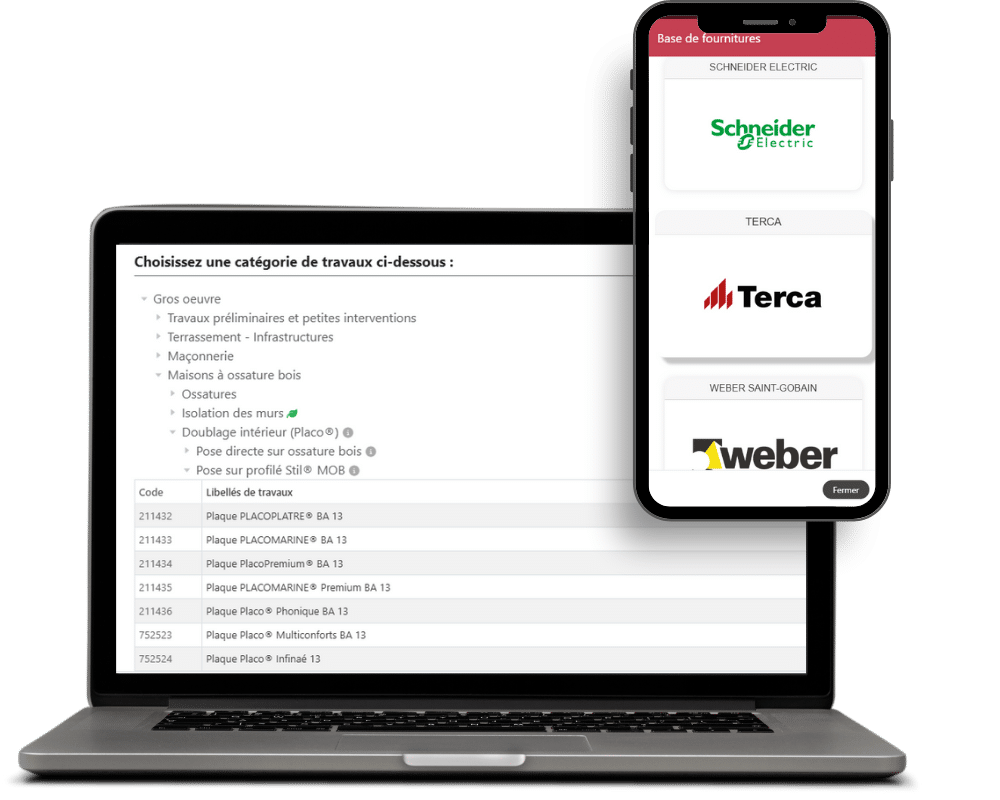 La plus complète du marché : +80 000 prix de travaux. Des prix régionalisés, précis et adaptés à chaque chantier, incluant libellés, temps de pose et prix fourni-posés selon la taille des travaux.